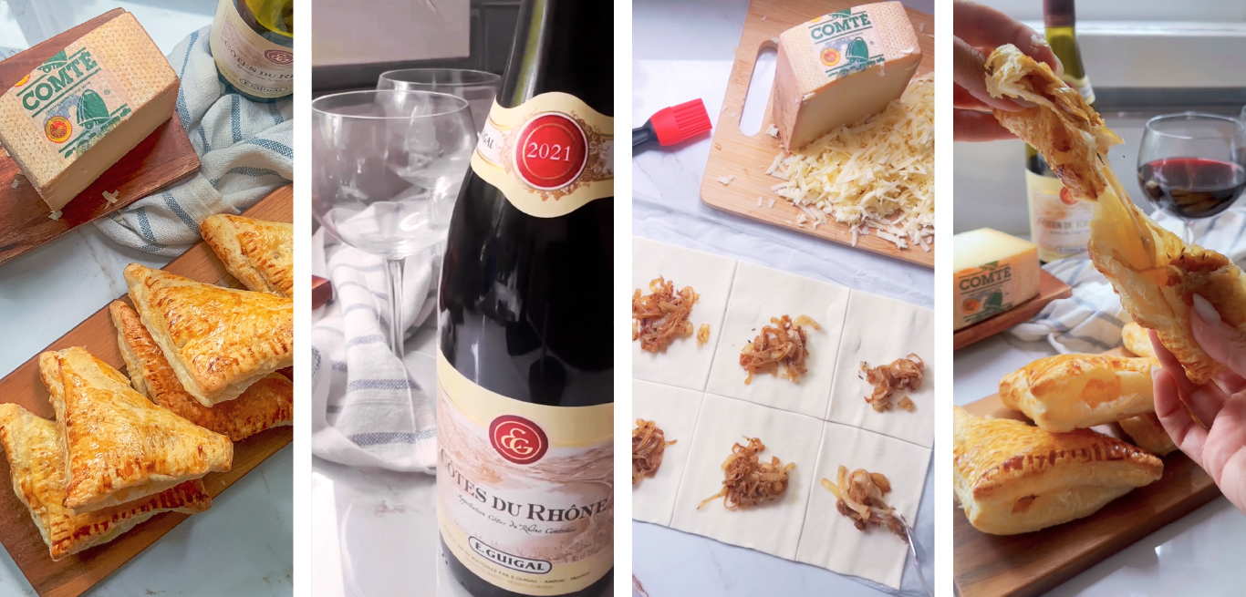 Try this delicious party snack: Comté cheese and caramelized onion pastry pockets, perfectly paired with Côtes du Rhône wines to impress your guests.